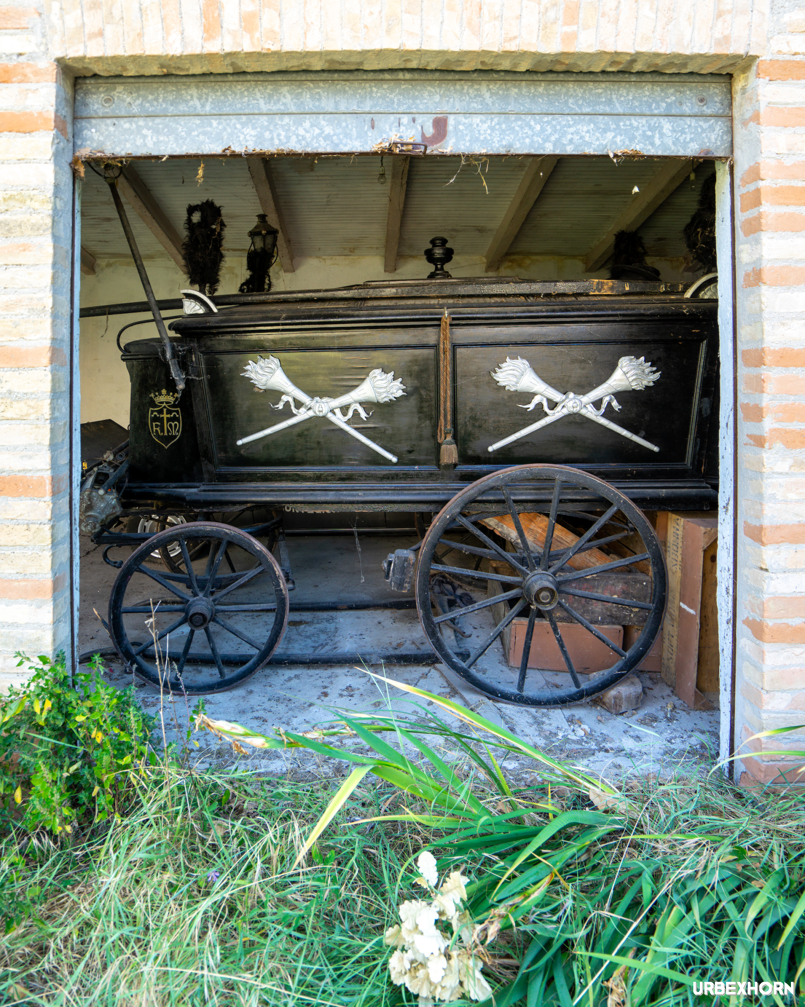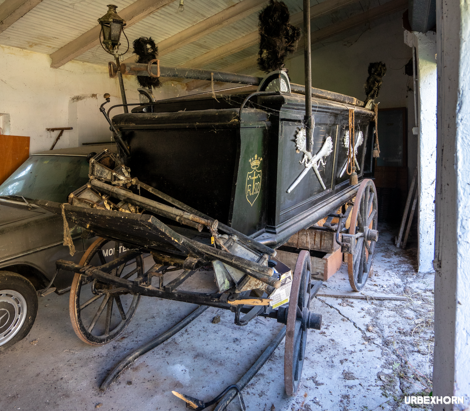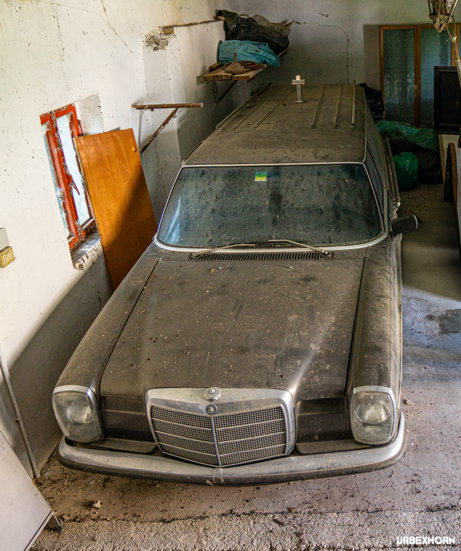 In the heart of a forgotten garage, beneath a thick gray shroud of dust and cobwebs, lie two ghosts from another era: an old dark wooden hearse, and beside it, a more recent sorrow frozen in silence — a Mercedes-Benz W114, transformed into a hearse, its once-elegant body now dulled by time and dust.