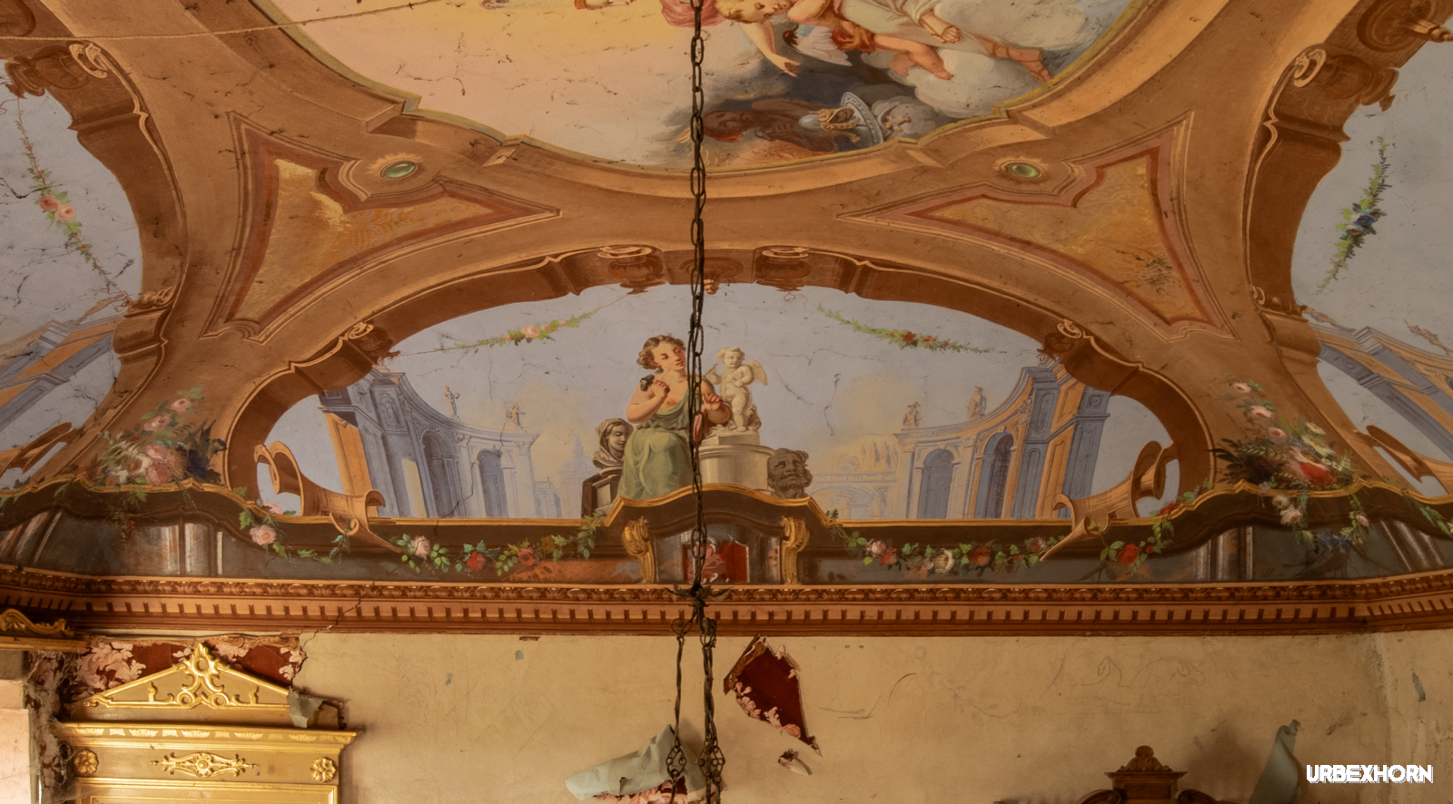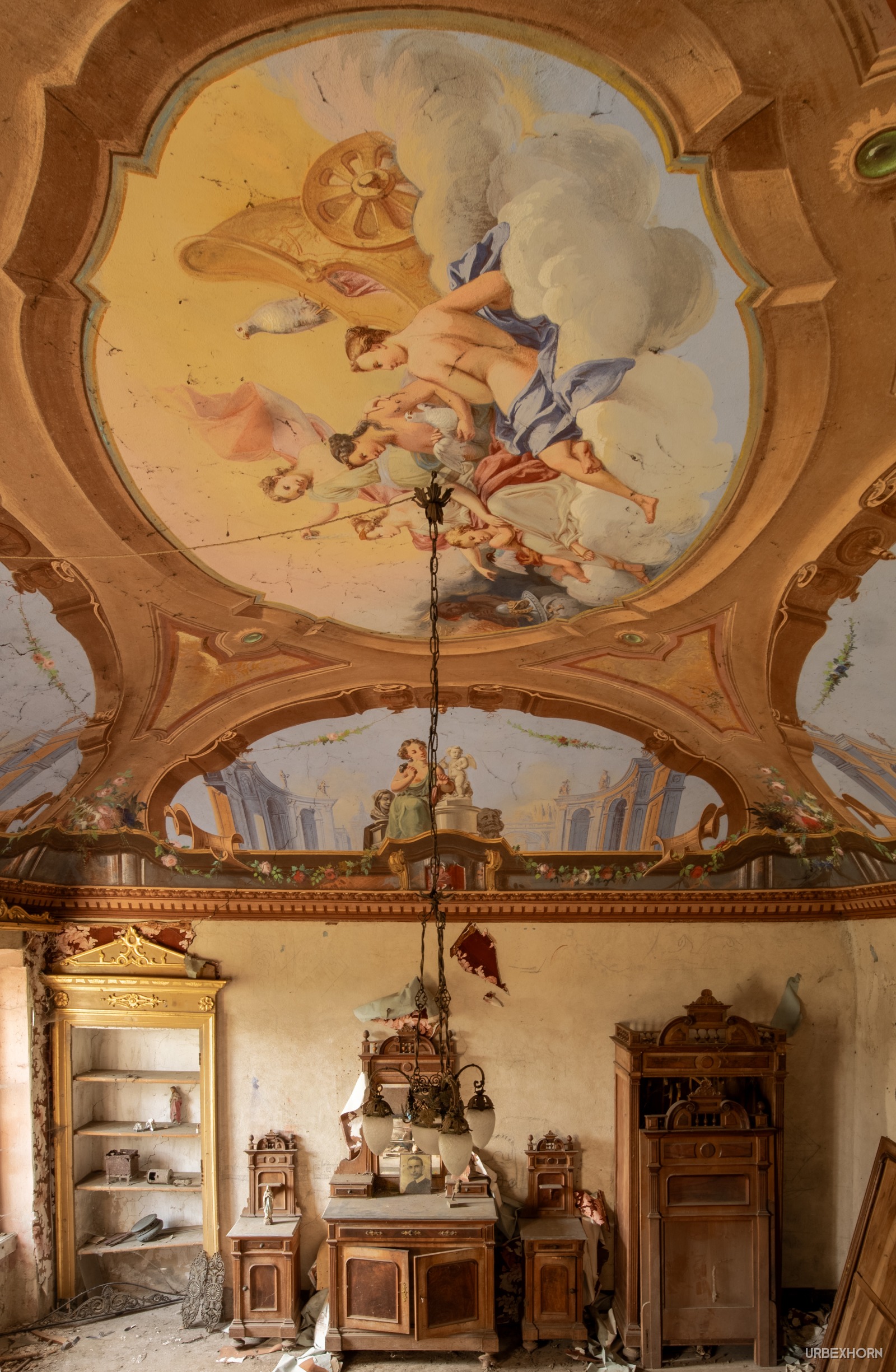 One of the most hard rooms to photograph: the 'Four Arts' in a faint yellow fresco. A tribute to creativity, with an artwork celebrating Painting, Sculpture, Architecture, and Literature on each side. The cabinet with the gilded frame awaits the definitive masterpiece: a decent photo of this chromatic chaos. Suggestions on white balance are welcome. Perhaps the Fifth Art is patience in Urbex