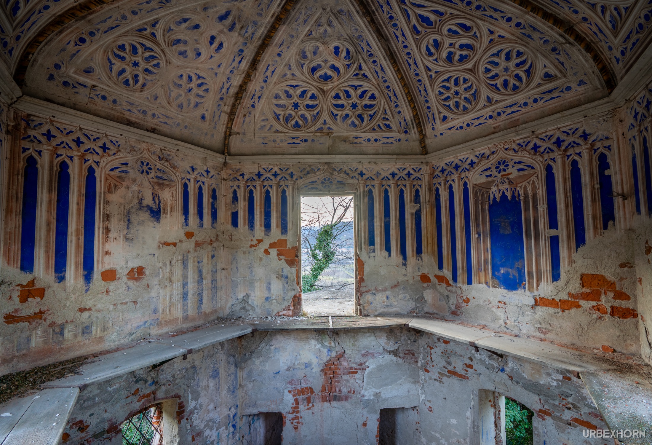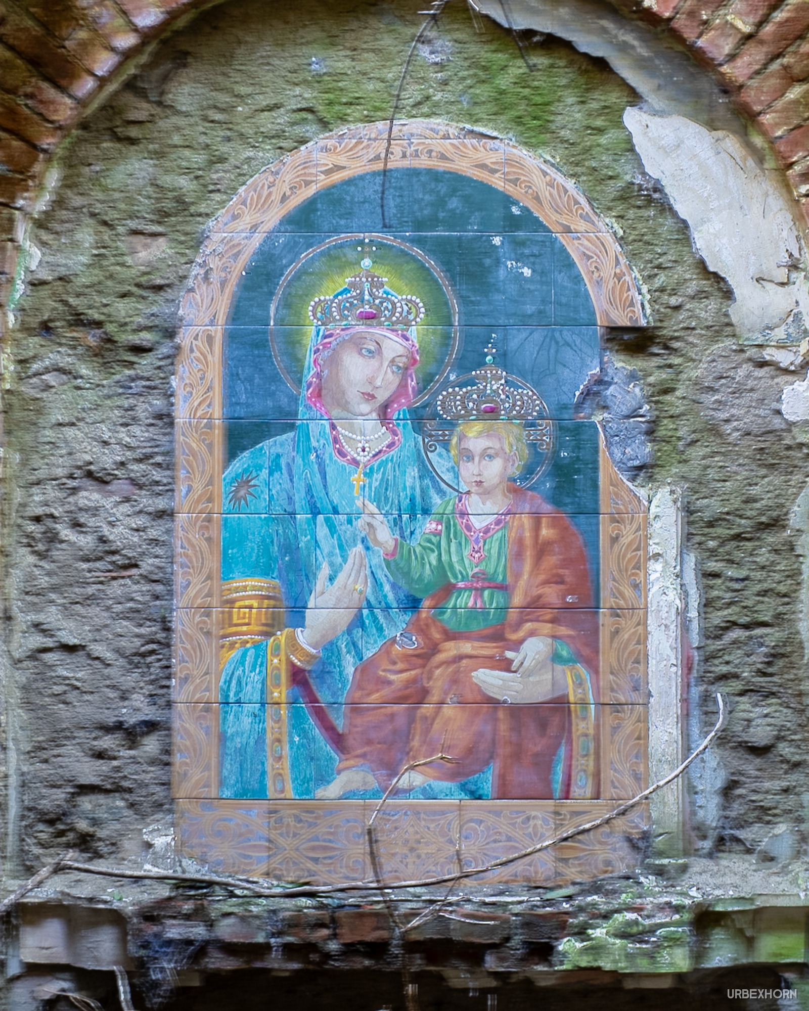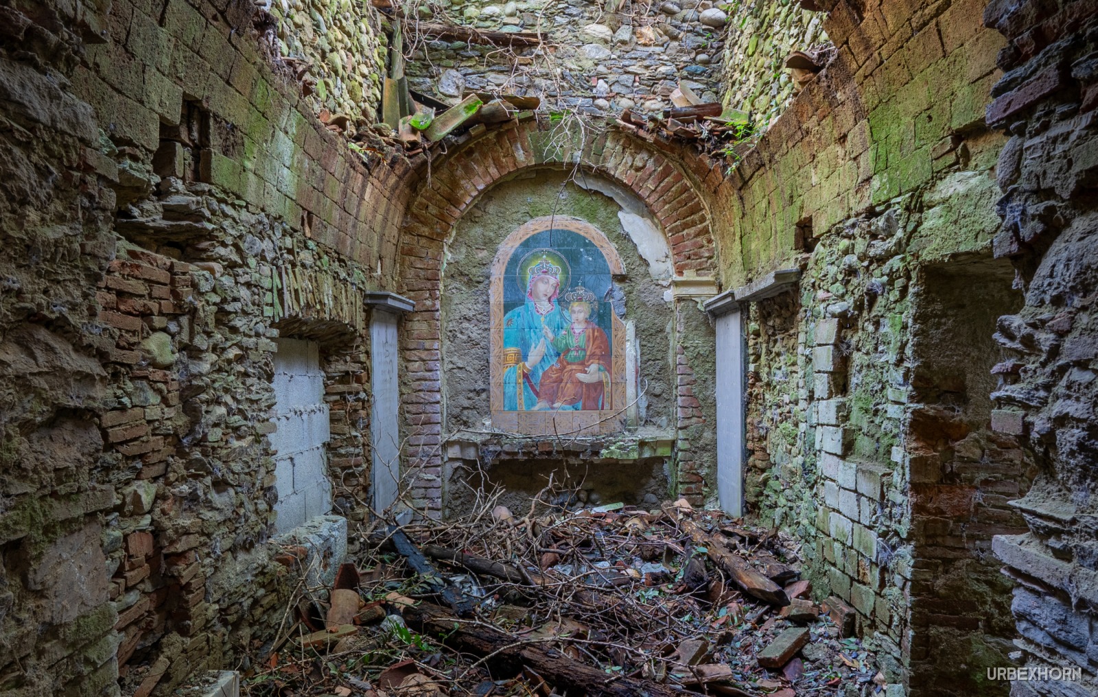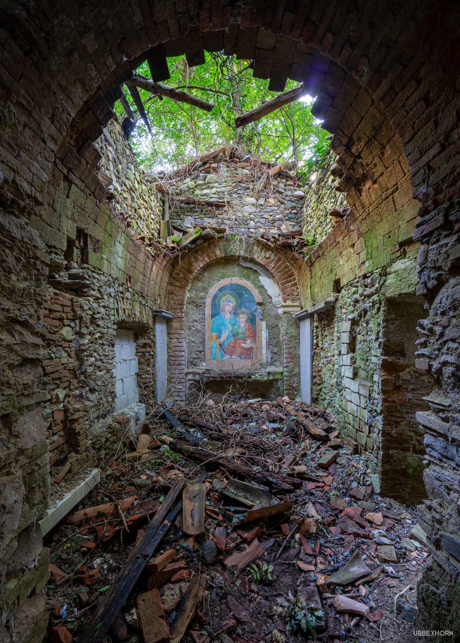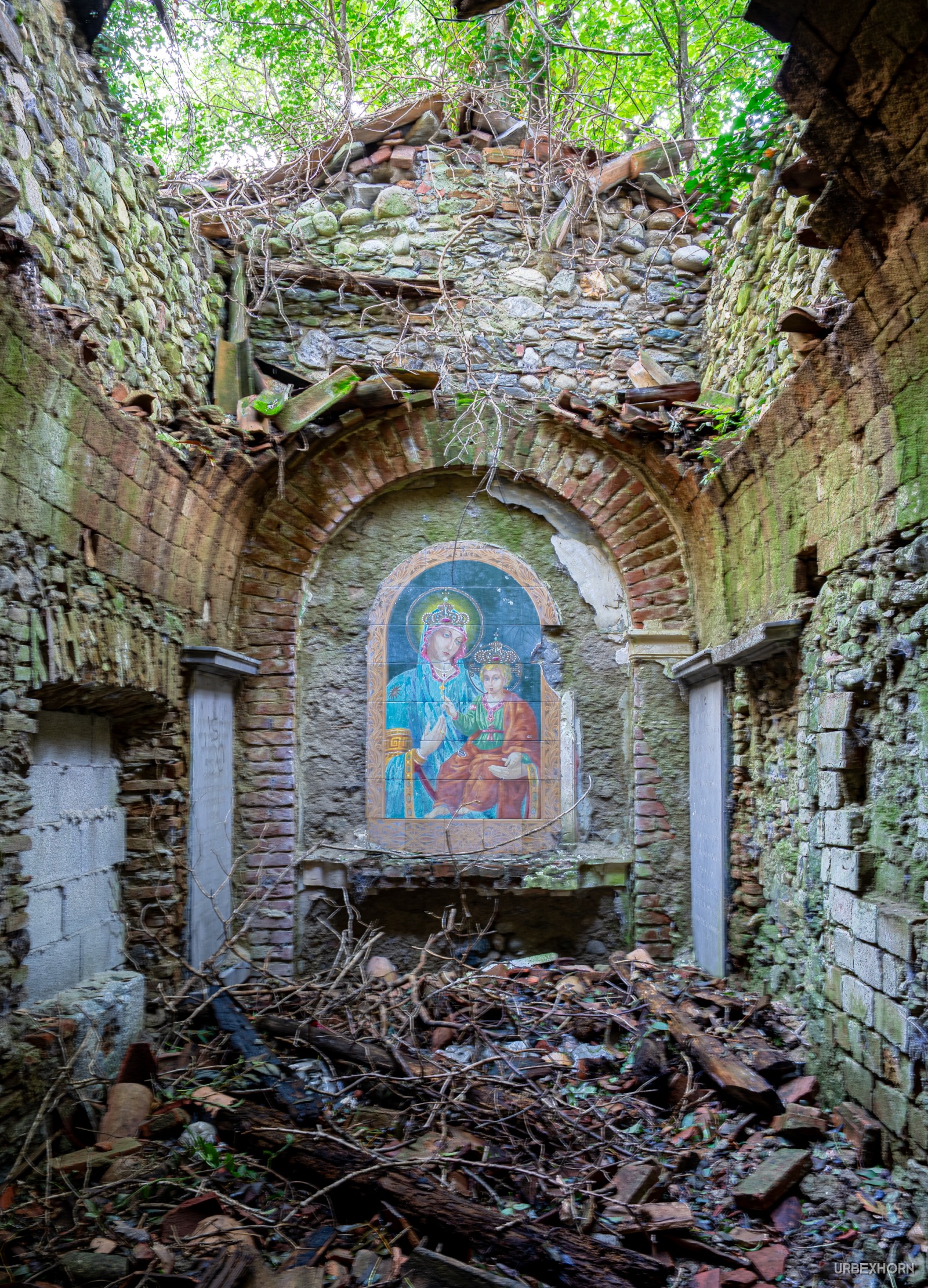 Like a Virgin 10/2024 church A small church in ruins. And amidst the chaos, the visual miracle: the fresco of the Madonna with the Child is intact, the only thing silhouetted against the sky. A fragment of art and love that refuses to become history. The last breath of faith. Photo Gallery