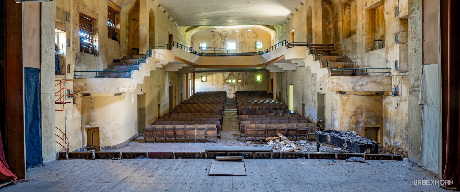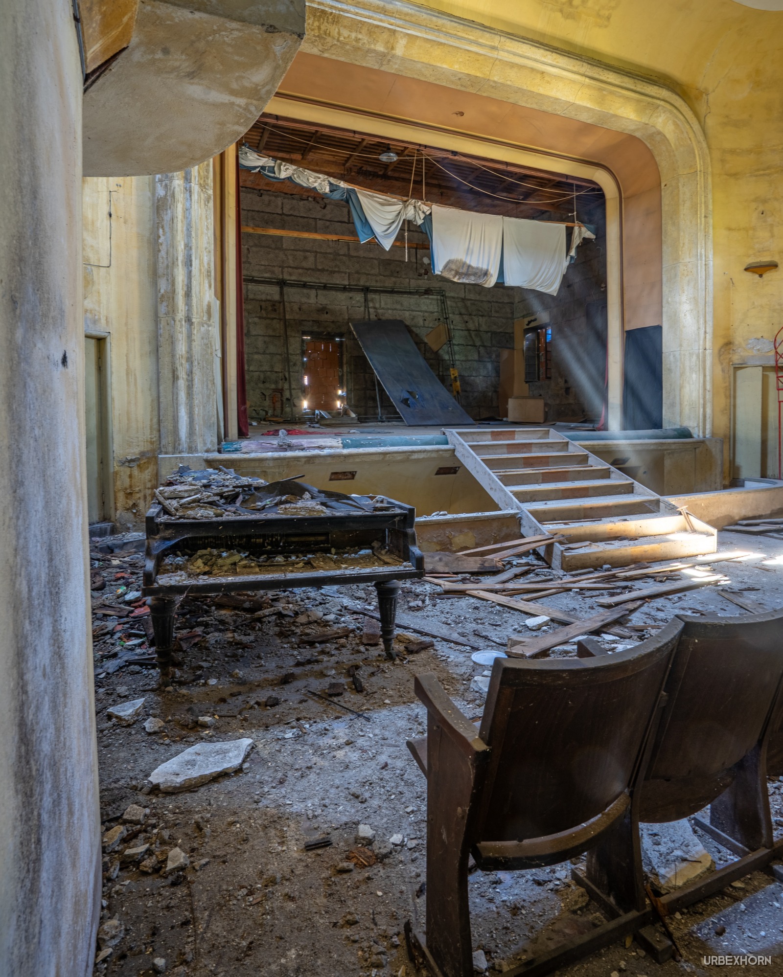 Curtain call. The show ended years ago, but nature has decided to stage the final act. The roof collapsed to create the perfect spotlight: a beam of sunlight falling directly onto the piano, the only performer who hasn't left the stage. The notes are trapped within dust-covered keys, yet in this silence, you can almost hear the echo of a final symphony. The theater doesn't die; it simply changes its audience.